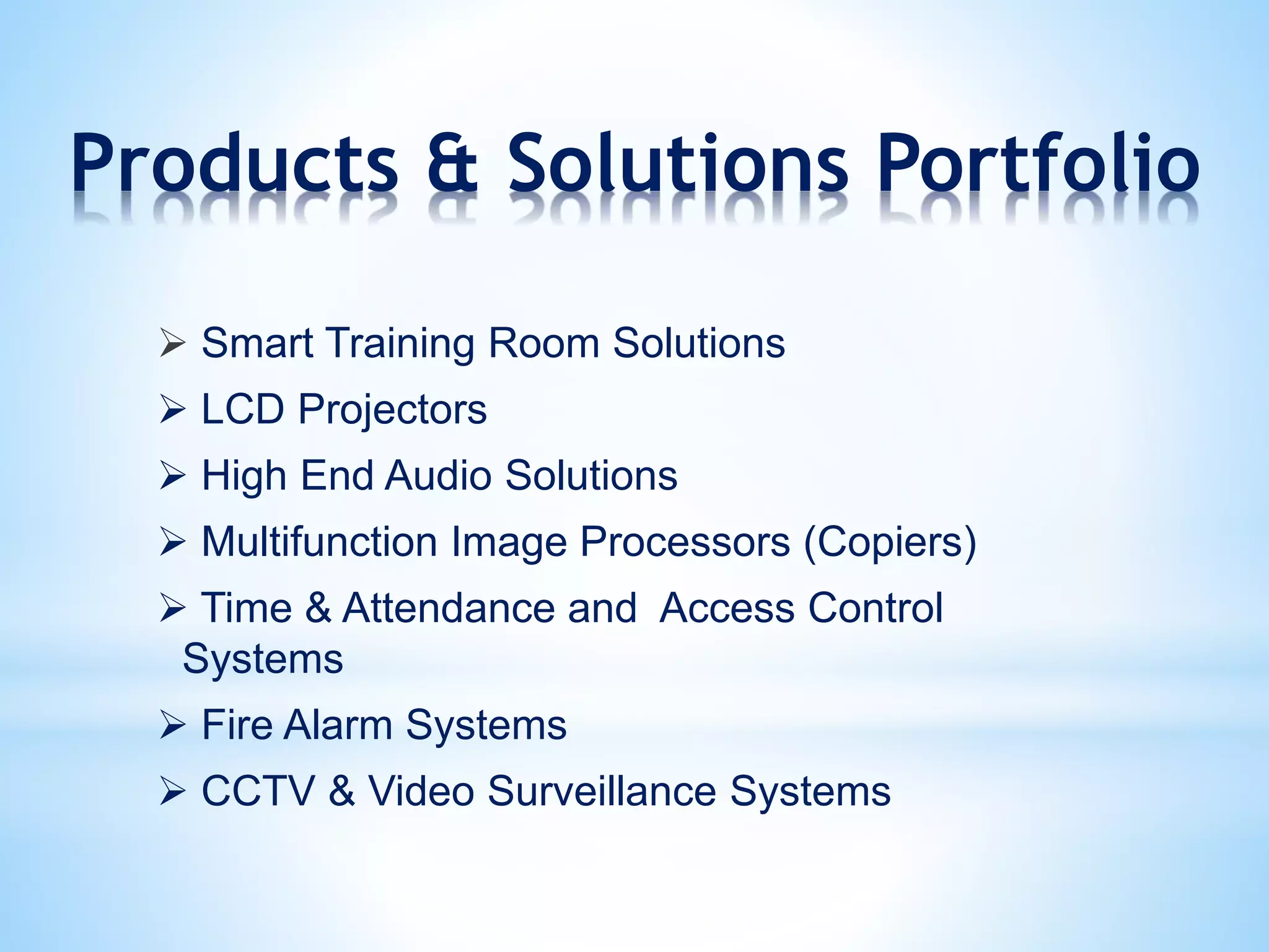 This document provides an overview of products and solutions offered across multiple categories: 1) Smart training room solutions including interactive boards and pods; 2) LCD projectors in various sizes and formats; 3) High end audio solutions such as PA systems and speakers; 4) Multifunction image processors like copiers and scanners; 5) Time and attendance systems using fingerprints or RFID; 6) Access control, fire alarm, and CCTV surveillance systems. A wide range of options are presented from reputable brands with services including installation and support.