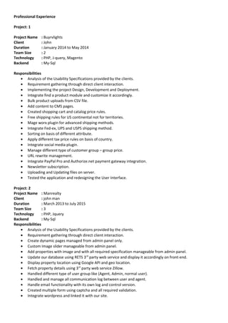 Niraj Singh has over 6 years of experience working as a software developer, primarily using PHP and HTML. He has experience with content management systems like Magento, WordPress, and Joomla. Some of his areas of expertise include API integrations, social media plugins, multi-lingual sites, payment gateways, source control systems, and customizing templates. He has worked on projects for clients in various industries, developing e-commerce sites, real estate sites, and a sales portal.