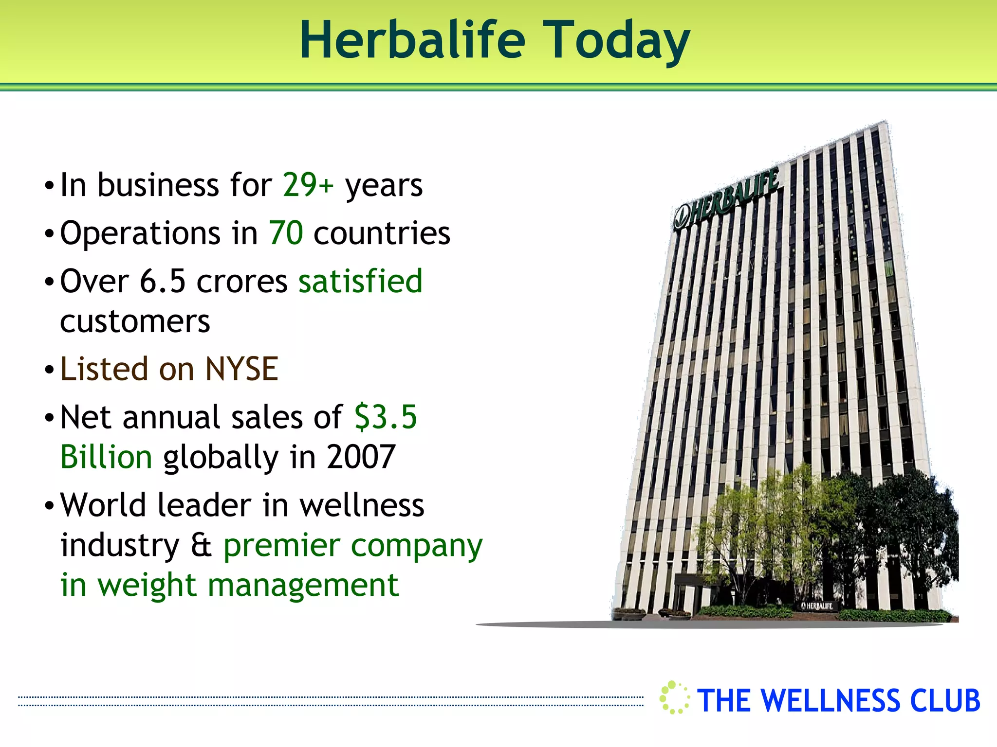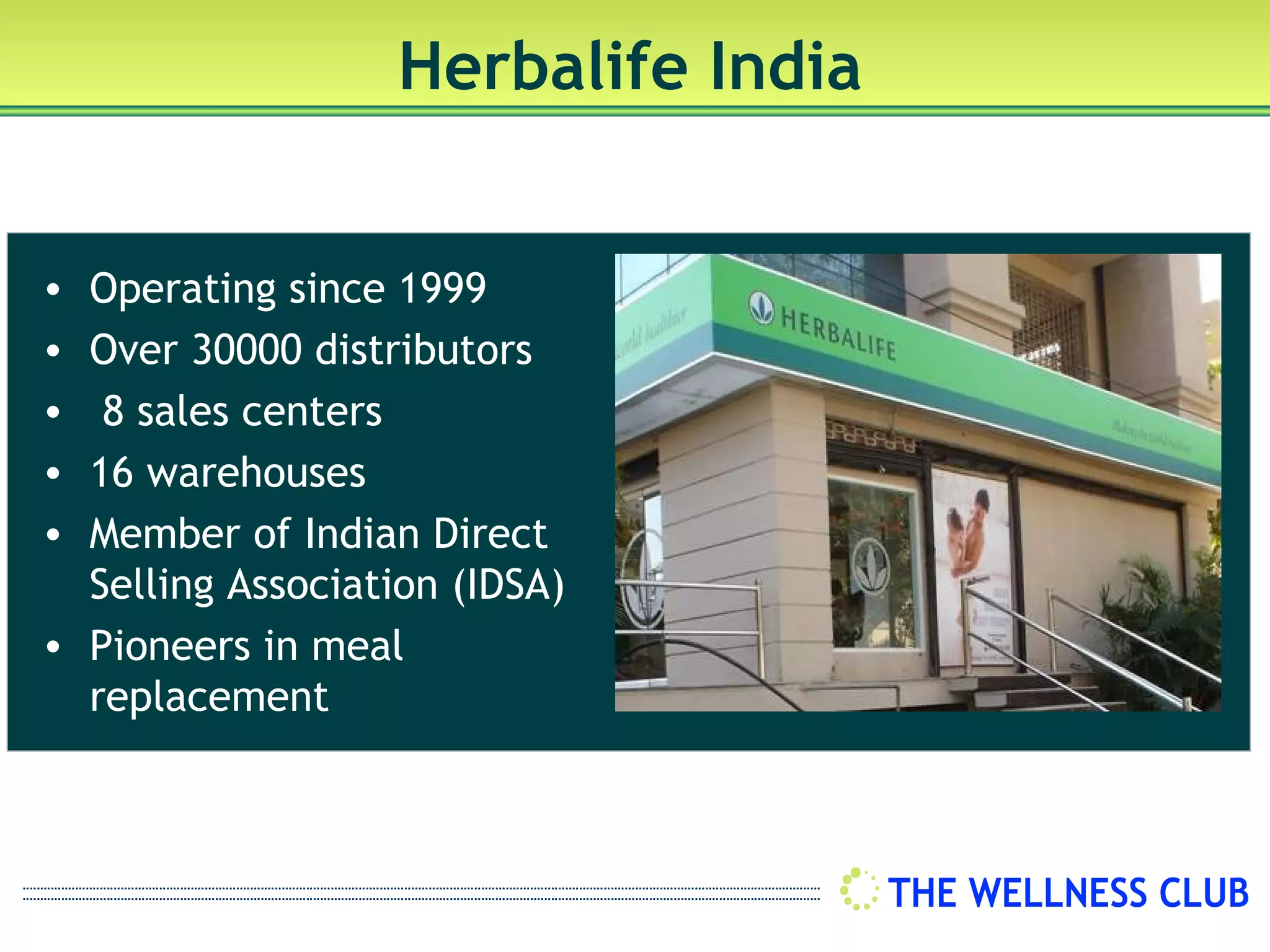 Herbalife is a global nutrition company that has been in business for over 29 years, operates in 70 countries, and has over 6.5 crore satisfied customers. It has annual global net sales of $3.5 billion and is the world leader in the wellness industry and weight management. In India, Herbalife has been operating since 1999 through over 30,000 distributors across 8 sales centers and 16 warehouses, and is a pioneer in meal replacement as well as a member of the Indian Direct Selling Association.