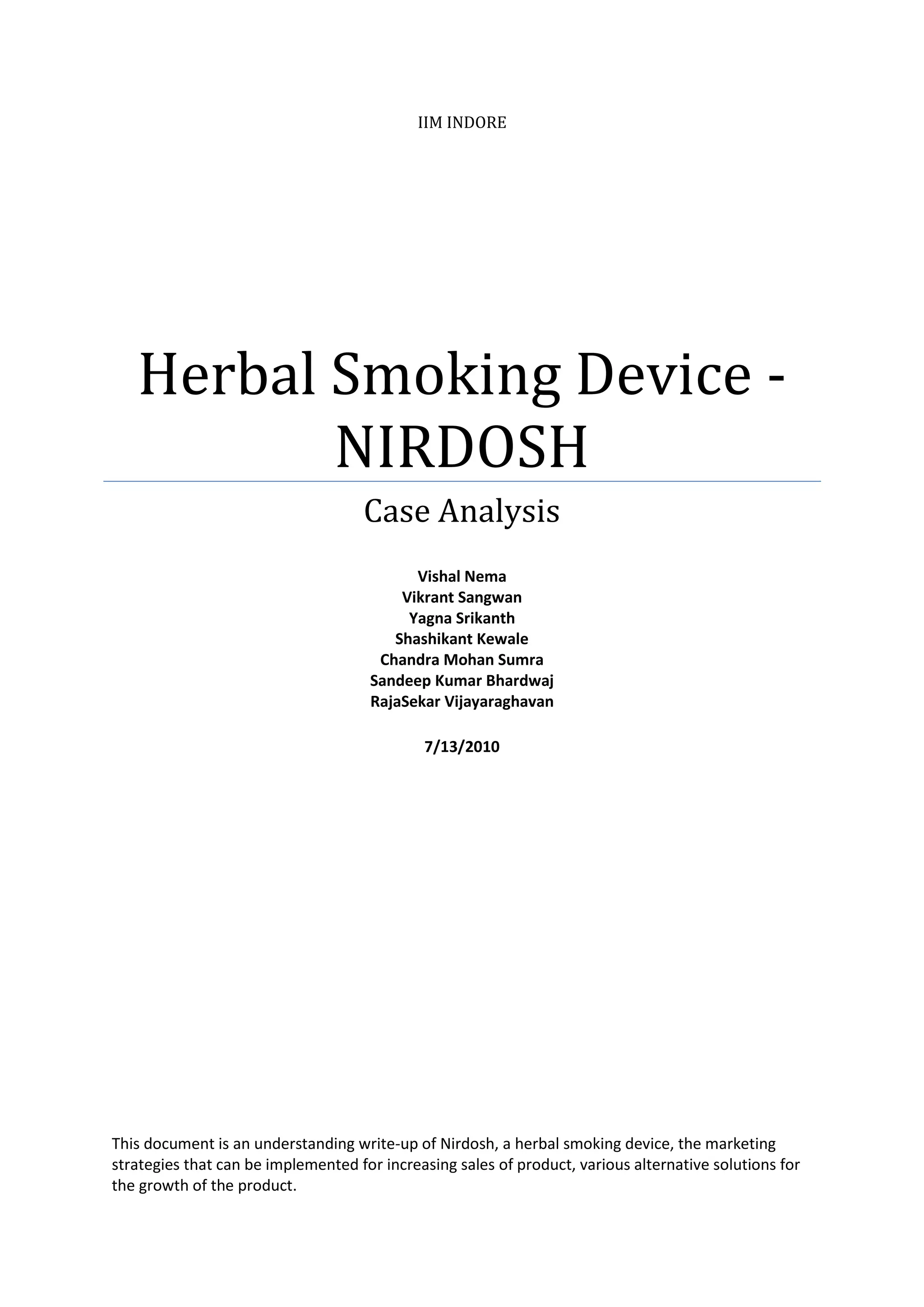 This document analyzes the herbal smoking device Nirdosh. It summarizes the product, objectives to increase market base and profitability. The marketing strategy proposed targeting cigarette smokers looking to quit by positioning Nirdosh as a healthier alternative, and the pharmaceutical industry by marketing its health benefits. Future prospects discussed expanding overseas, targeting the paan market, and establishing Nirdosh as a national brand in India.