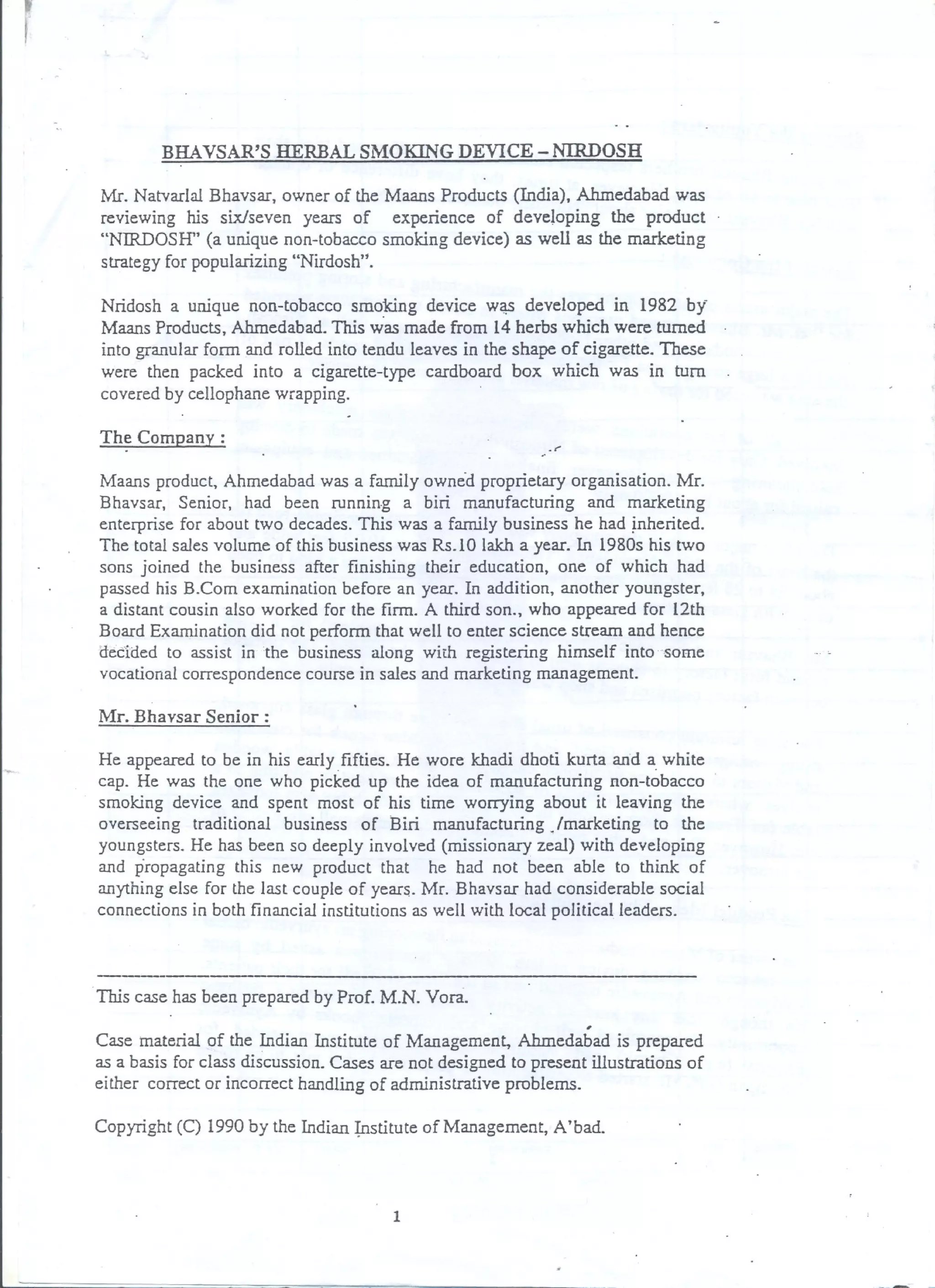 - The case discusses Nirdosh, a herbal smoking device developed by Maans Products in Ahmedabad, India. It describes the product's development over 7-8 years, including selecting herbs, developing a rollable mixture, packaging, and manufacturing. It also discusses the founder's efforts to promote the product and the market opportunity for Nirdosh as either an alternative to tobacco or as a health product. However, sales have remained low at around Rs. 1.5 lakhs per year.