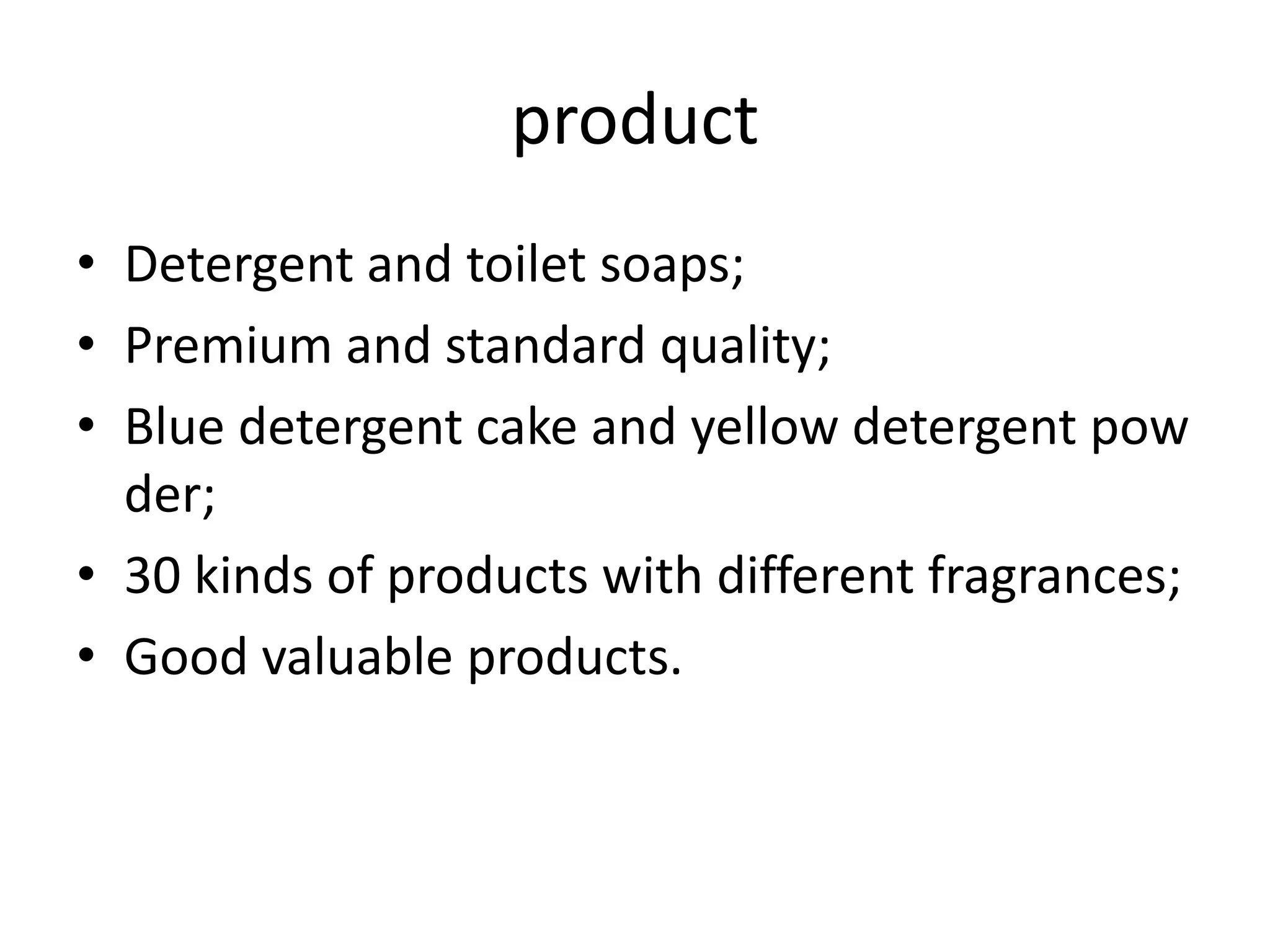 This document discusses Nirma's product line, pricing strategy, distribution channels, and promotional activities. Nirma produces 30 kinds of detergent and soap products in blue and yellow, at premium and standard quality levels. It sells products across India through a principal distribution channel of 450 distributors and a parallel channel of 2000 distributors to achieve wide market reach. Nirma's iconic jingle promoting the product's effectiveness has been used for 42 years and relies on local newspaper and regional TV ads.