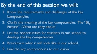 This document discusses key competencies from the New Zealand curriculum. It will: