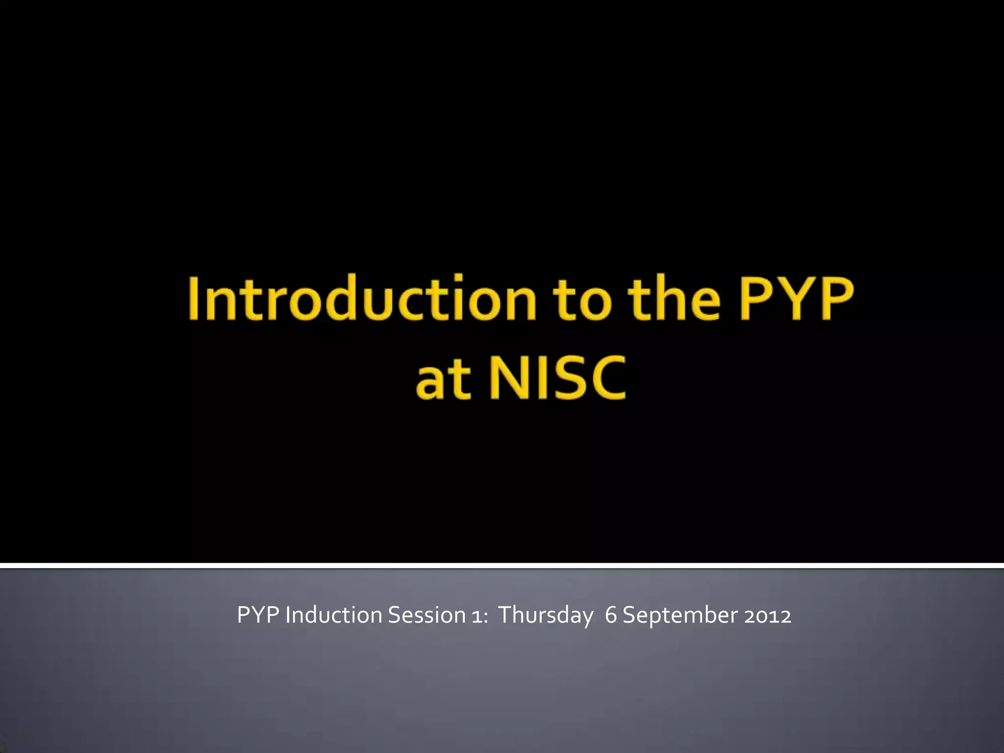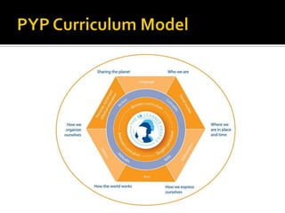 The document provides an overview of the Primary Years Programme (PYP), including its core components and structure. It discusses the PYP's focus on developing lifelong learners, international-mindedness, inquiry-based and conceptually-driven learning. It also outlines the PYP's transdisciplinary themes, concepts, attitudes, skills, learner profile, and authorization process.