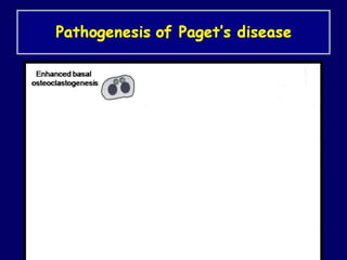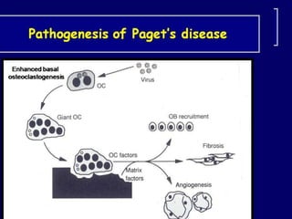 Paget's disease of bone is a chronic disorder that results in enlarged and deformed bones. It causes excessive breakdown and formation of bone tissue. Common symptoms include bone pain, headaches, hearing loss, and bone deformities. It is diagnosed through x-rays showing abnormal bone growth patterns. Treatment involves bisphosphonate drugs, calcitonin injections, surgery for joint problems or deformities, and maintaining calcium/vitamin D levels through diet and exercise. Exercise can help with mobility and reduce pain.