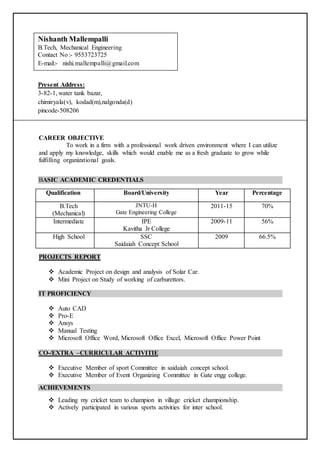 The document is a resume for Nishanth Mallempalli seeking a job where he can apply his mechanical engineering knowledge and skills. He completed his B.Tech in Mechanical Engineering from JNTU-H Gate Engineering College in 2015 with 70% marks. His academic qualifications also include 56% in Intermediate and 66.5% in High School. He has work experience with AutoCAD, Pro-E, Ansys and Microsoft Office. His personal details note he was born in 1994 in India and enjoys badminton, cricket and internet browsing.