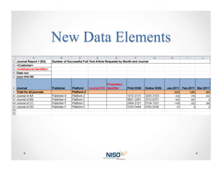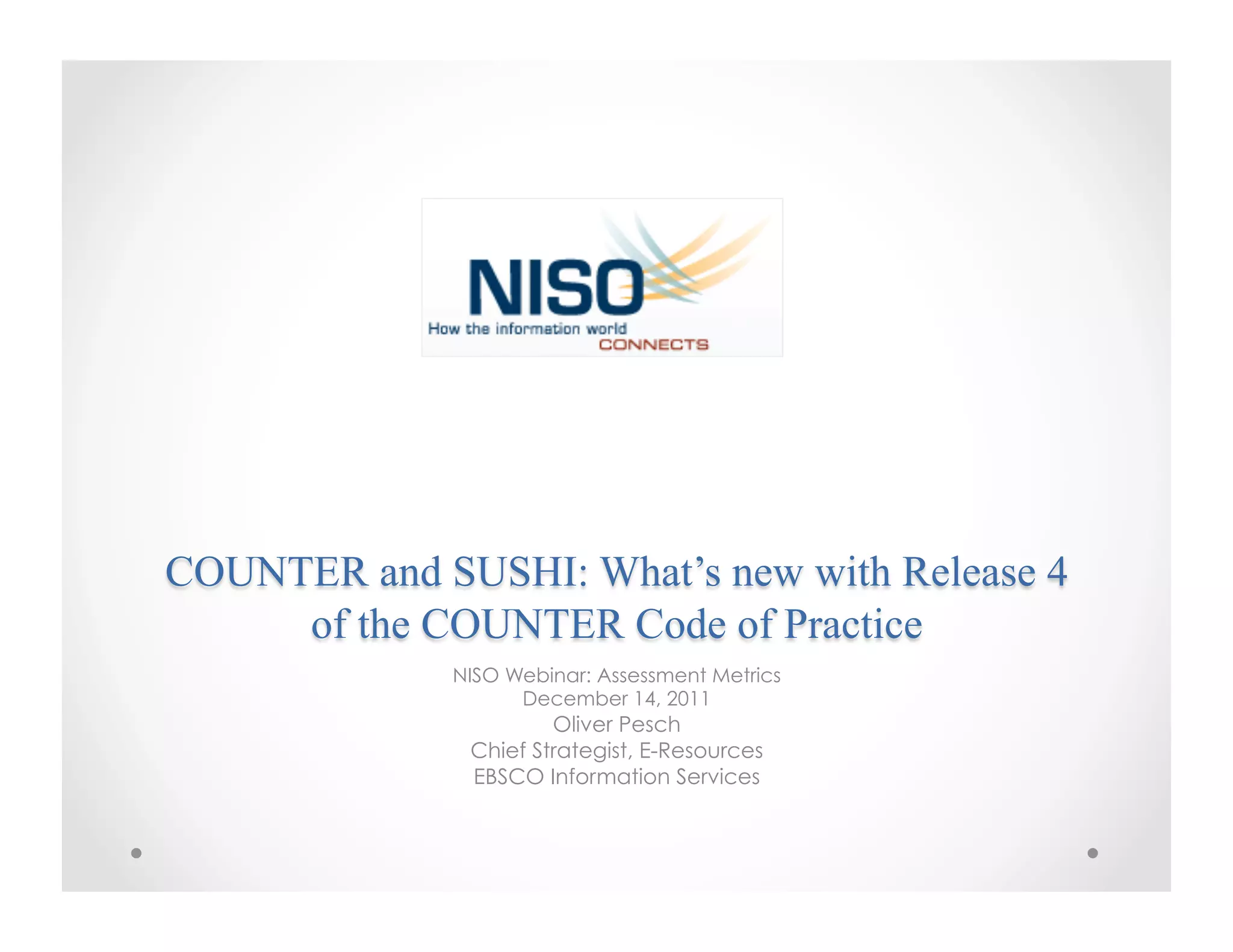 The NISO webinar on December 14, 2011, presented by Oliver Pesch, discussed updates to the COUNTER Code of Practice, emphasizing improvements such as enhanced compliance measures, new reporting metrics, and institutional identifiers. Key updates include the incorporation of gold open access articles, more precise measures of database usage, and the streamlined implementation of SUSHI for usage reporting. The document outlines critical deadlines for comments, publication, and compliance deadlines for the new standards.