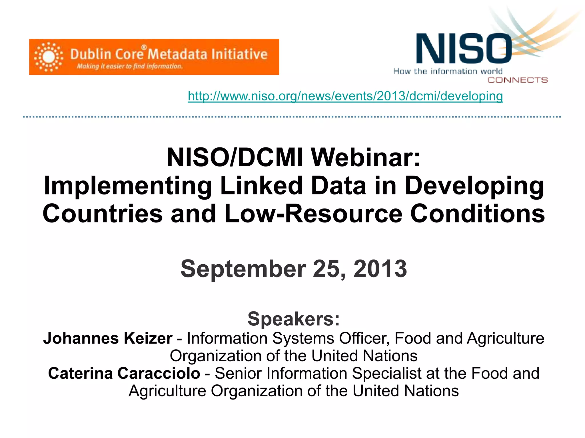 The NISO/DCMI webinar on September 25, 2013, discussed the implementation of linked data in developing countries with limited resources. Key topics included the difficulties of data generation, the significance of using standard vocabularies, and the importance of collaboration among institutions to overcome challenges. The discussion highlighted that linked data technologies must become more accessible and resource-efficient to encourage adoption in low-resource contexts.