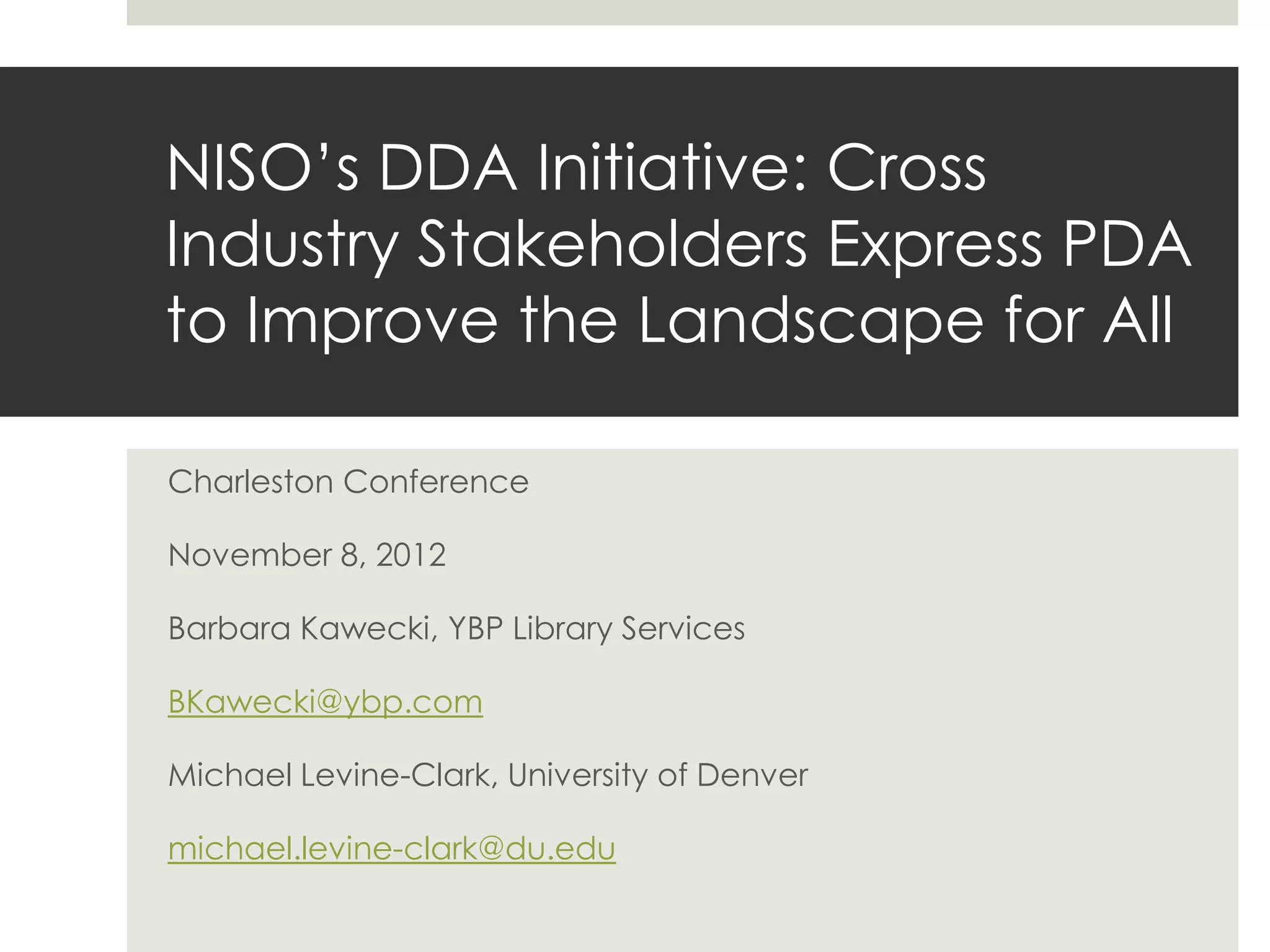 The document discusses the implementation of a Demand-Driven Acquisition (DDA) initiative aimed at improving library material procurement through patron engagement. It outlines the goals of DDA, the need for best practices, recommended methods for managing content, and a timeline for developing flexible models that meet various library needs. The initiative involves collaboration among stakeholders, including libraries, publishers, and vendors, to enhance access and discoverability of resources.