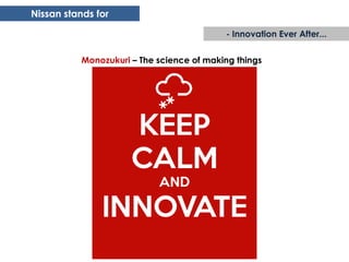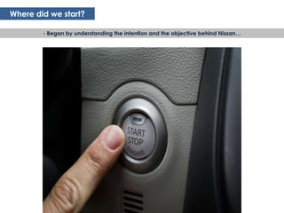 The document summarizes Nissan's strategy to shift from focusing solely on vehicles to facilitating transportation and travel. It identifies three consumer groups - early adopters, Uber Greens, and lazies - and sees an opportunity to offer a digital Nissan Route ID that provides discounted services for travel, parking, hotels, and more. This ID aims to deliver customers from routine inconveniences by anticipating needs and developing sustainable solutions. Nissan Route will borrow credibility from the Nissan brand and vibrancy from the Nissan Shift initiative to position itself as a "hero" that delivers customers.