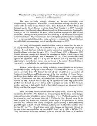 The document discusses the strategic alliance between Renault and Nissan, highlighting Renault's strengths as a leader in small car production and its need for expansion into new markets, particularly in Asia and North America. Conversely, it details Nissan's financial struggles, including high debt and inefficiencies, and emphasizes the potential benefits both companies could derive from a partnership. Ultimately, the document suggests that through collaboration, both Renault and Nissan can leverage each other's strengths to improve market position and operational effectiveness.