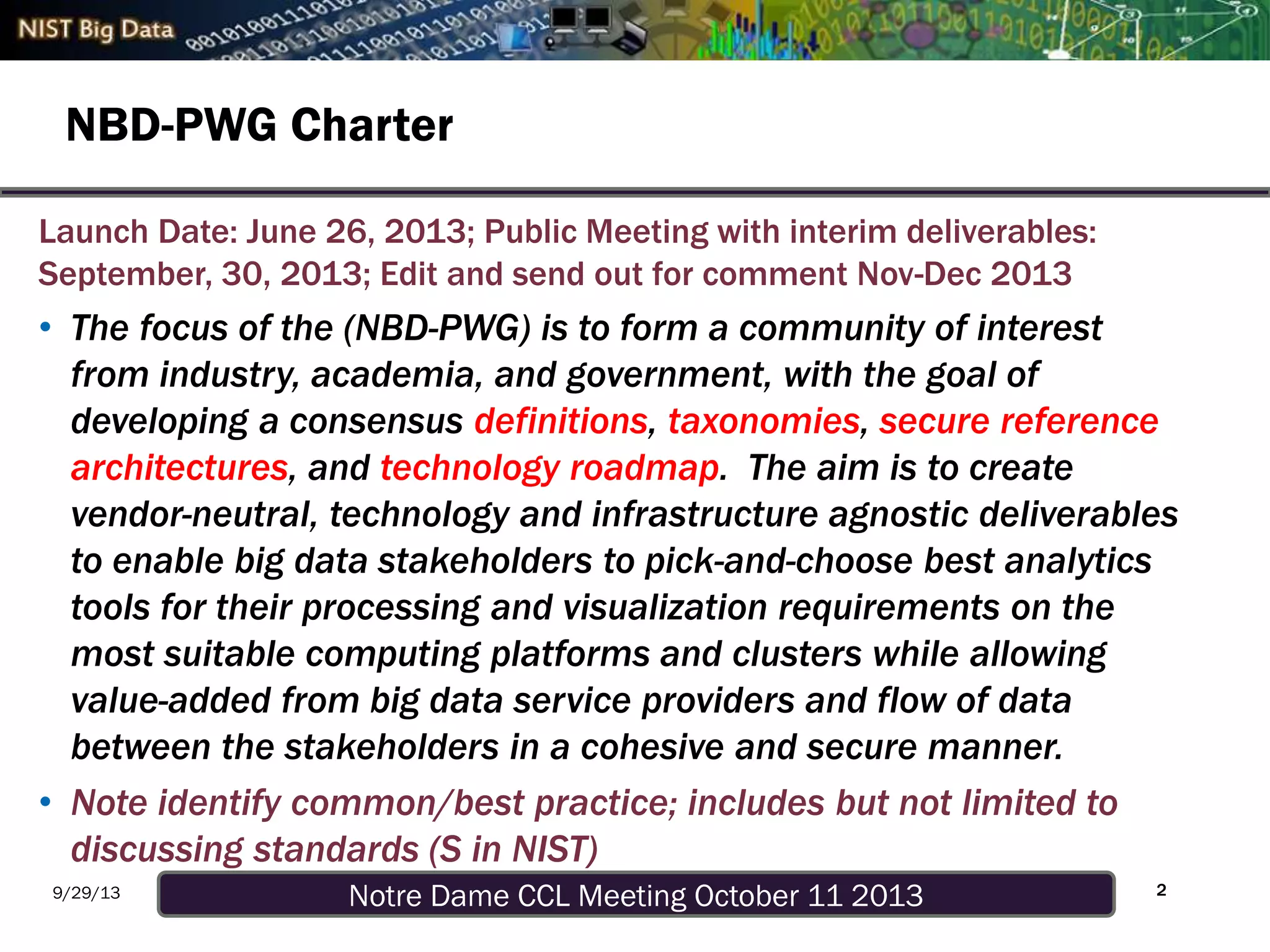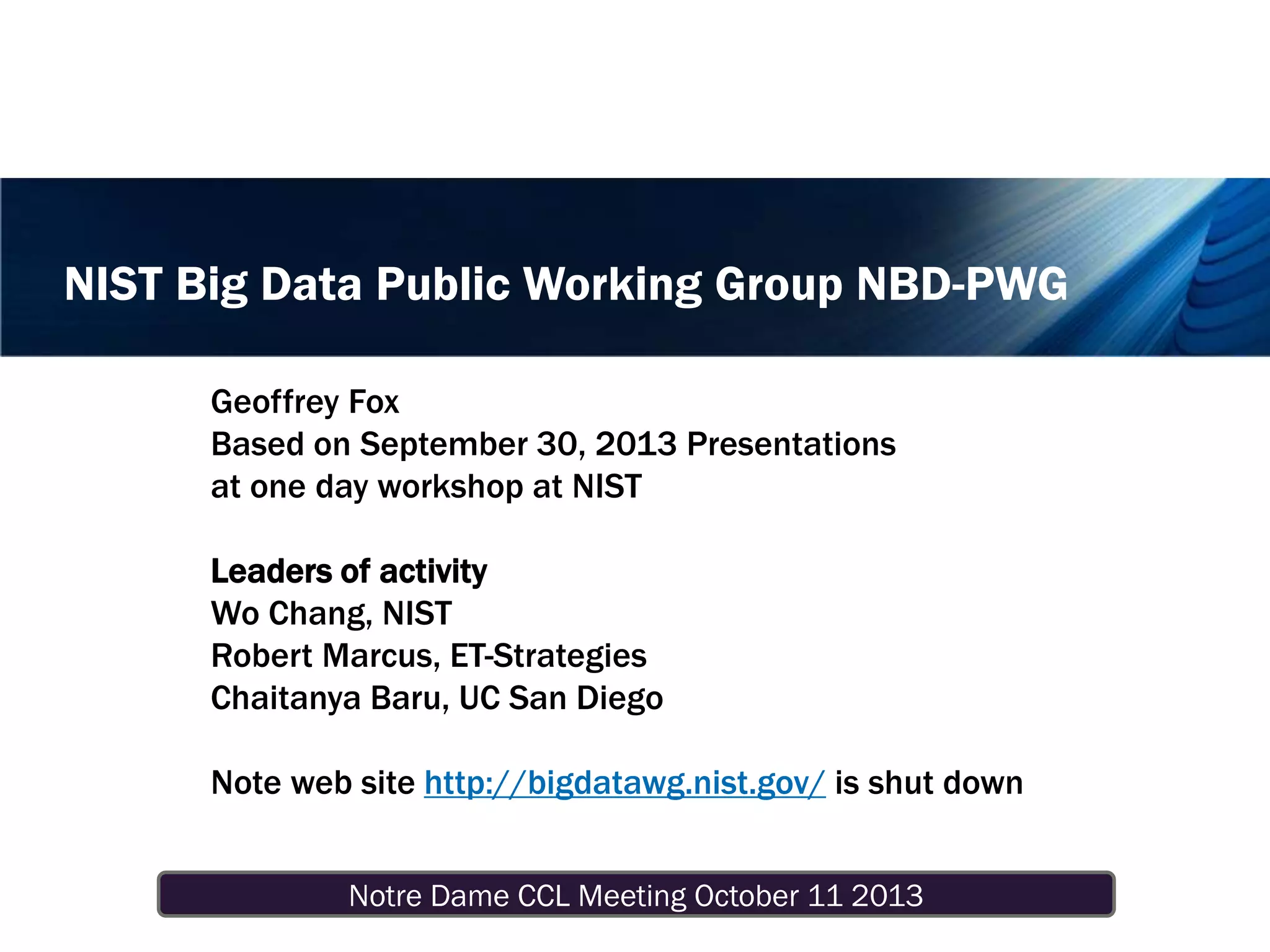 The Notre Dame CCL meeting on October 11, 2013, focused on the NIST Big Data Public Working Group (NBD-PWG) and its initiatives to form a community from industry, academia, and government to develop consensus definitions and technology roadmaps for big data. Various subgroups were established to address specific areas such as requirements, definitions, reference architecture, and security. The document outlines use cases across different sectors, trends in data science and technology, and future steps for implementing big data solutions.