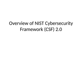 The NIST Cybersecurity Framework (CSF) 2.0 provides guidance to organizations on managing cybersecurity risks, enhancing understanding, assessment, and communication efforts across different sectors and sizes. It includes a taxonomy of high-level cybersecurity outcomes and components such as identification, protection, detection, response, and recovery. CSF 2.0 is flexible and non-prescriptive, offering a structured approach along with links to online resources for additional support.