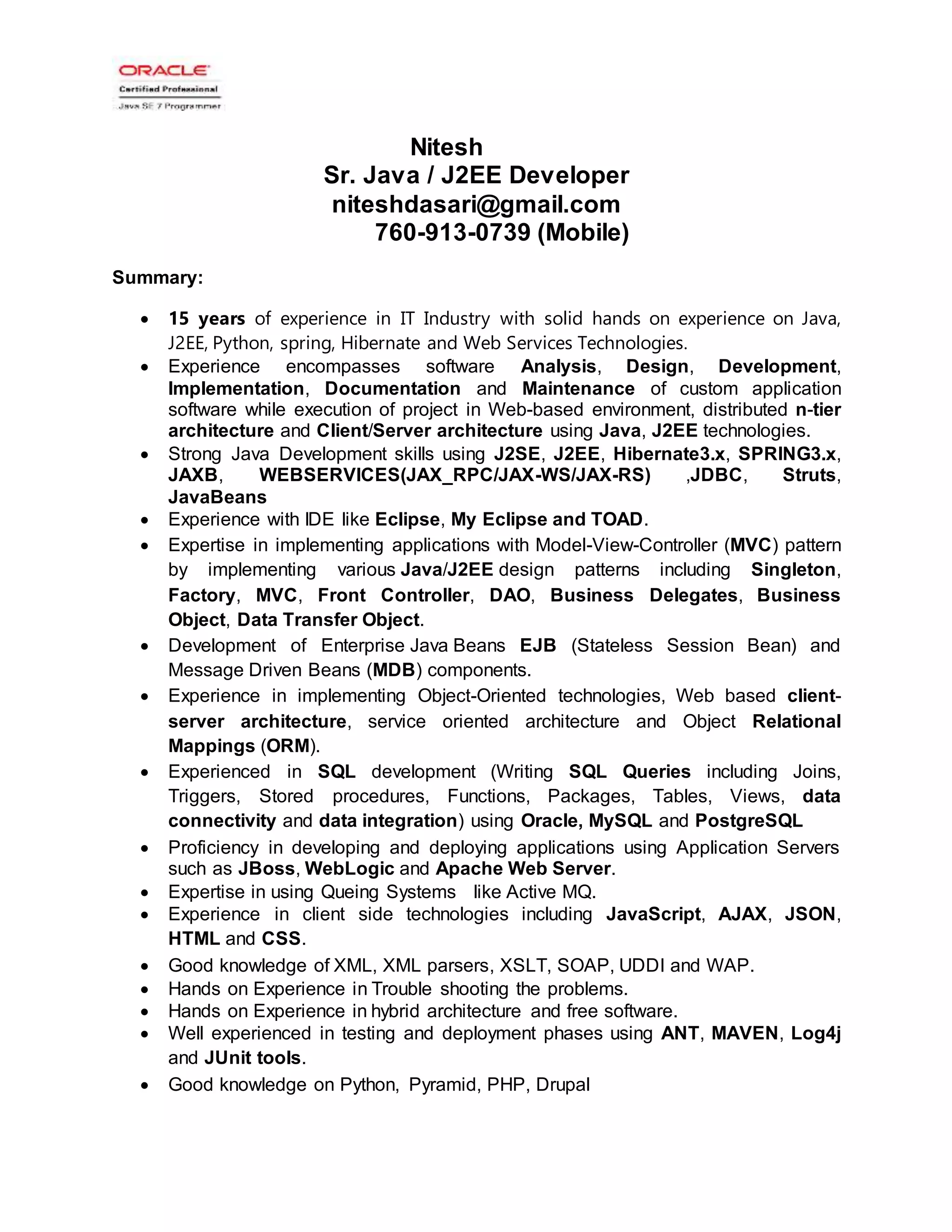 This document contains the resume of Nitesh, who has 15 years of experience as a Java/J2EE developer. He has extensive skills in technologies like Java, Spring, Hibernate, Python, and web services. He has worked on projects involving software development, maintenance, testing and deployment. His most recent role was as a senior Java developer at ViaSat where he worked on an Agile project using technologies like Spring MVC, Hibernate and Oracle database.