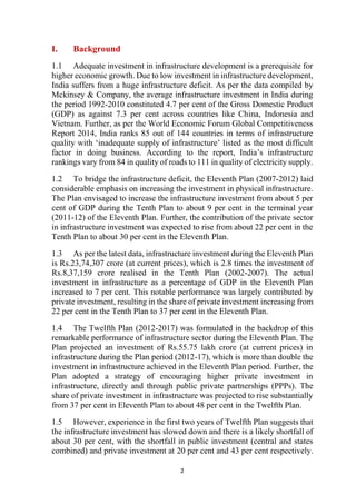 This document provides an overview of public private partnerships (PPPs) in India's infrastructure sector. It discusses the background and need for PPPs to boost infrastructure investment. Several initiatives were taken over the Eleventh and Twelfth Plans to promote PPPs, including setting up institutions to appraise projects, providing viability gap funding, and developing standard documents. While over 280 projects were approved, implementation has faced challenges. PPPs have been most successful in roads but need reviving, with issues like aggressive bidding and delays in land acquisition and clearances needing addressing.