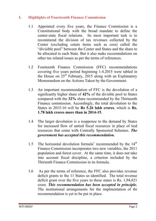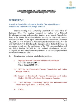 The document provides an overview of the National Institution for Transforming India (NITI) and discusses the implications of the Fourteenth Finance Commission's recommendations and the Union Budget for 2015-16. It details significant changes in fiscal devolution to states, highlights from the Economic Survey, and challenges related to public investment, gender inequality, and agricultural markets. Additionally, it outlines the Union Budget's expenditures and intended reforms to facilitate a national agricultural market and structural transformation in key sectors.