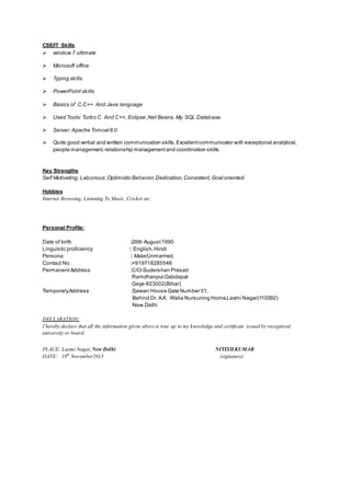 Nitish Kumar is seeking a job in a creative and challenging environment where he can utilize his technical skills and abilities in computer science and engineering. He has a B.Tech in computer science engineering from Bhutta College of Engineering and Technology with 74.8% marks. He has work experience at the Council of Scientific and Industrial Research since October 2015. His technical skills include ASP, web designing, Dreamweaver, Visual Studio 2015, C, C++, Java, MySQL, Apache Tomcat. He has completed training programs in C++, Java core, and advanced Java. His projects include a banking application and private chat application. His hobbies include internet browsing, listening to music, and cricket.