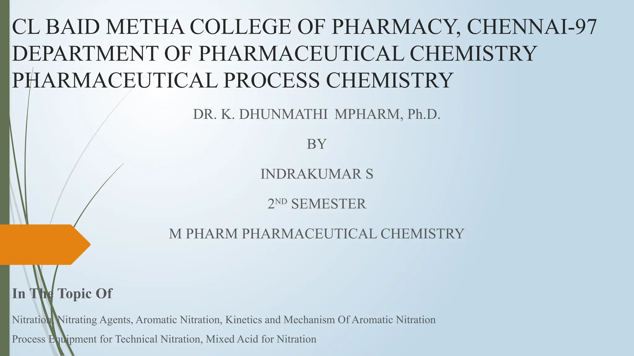 The document discusses the process of nitration in organic chemistry, outlining the mechanisms, reagents, and significance of various nitration products including solvents, dyestuffs, pharmaceuticals, and explosives. It also details the equipment and techniques used for both batch and continuous nitration processes, highlighting differences in safety, efficiency, and operational flexibility. Additionally, it emphasizes the effects of substituents on reactivity and product distribution during aromatic nitration.