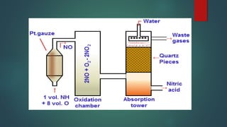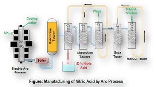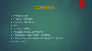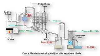 The document provides information about nitric acid, including its physical and chemical properties, manufacturing processes, uses, and production in Pakistan compared to worldwide. It describes nitric acid as a colorless liquid used to make fertilizers, dyes, and explosives. Three common industrial methods are discussed for manufacturing nitric acid: the Chile saltpeter method using sodium nitrate, Birkland-Eyde's method using air, and Ostwald's ammonia oxidation process. Nitric acid production in Pakistan is compared to global production levels, and major Pakistani nitric acid producers are listed.
