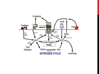 Nitrogen is an essential element that cycles through various forms in the environment. The nitrogen cycle involves nitrogen fixation, ammonification, nitrification, and denitrification processes carried out by microorganisms. Nitrogen fixation converts atmospheric nitrogen gas into ammonium which can then be used by plants and other organisms. Ammonification and nitrification convert organic nitrogen and ammonium into nitrates. Denitrification returns nitrogen to the atmosphere as nitrogen gas. The nitrogen cycle is crucial for ecosystems as it makes nitrogen available to support primary production.
