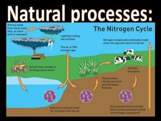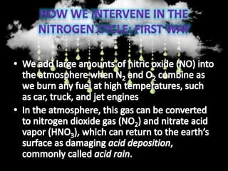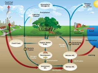 The nitrogen cycle describes the movement of nitrogen through the environment. It involves nitrogen fixation by bacteria, ammonification by decomposers, nitrification by soil bacteria, and denitrification by bacteria in waterlogged soils that converts nitrogen back to its gaseous form. Human activities such as fossil fuel combustion, use of nitrogen fertilizers, and livestock ranching have significantly increased the global nitrogen cycle, causing issues like smog, acid rain, eutrophication, and increased greenhouse gas emissions. While some seek solutions, many nations prioritize food production over environmental impacts.