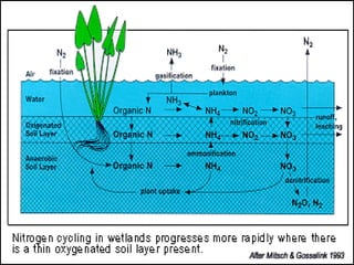 The document describes the nitrogen cycle, including its various sources, forms, reservoirs, and transformations. Key processes in the nitrogen cycle include nitrogen fixation by bacteria and cyanobacteria; ammonification and mineralization of organic nitrogen into ammonium; nitrification of ammonium to nitrite then nitrate by microbes; and denitrification of nitrates back to nitrogen gas by other microbes under anaerobic conditions. The nitrogen cycle is essential for providing nitrogen, a limiting nutrient, to living organisms and maintaining a balanced global nitrogen reservoir.