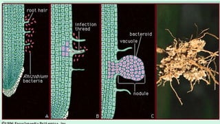 Nitrogen fixation is the process by which nitrogen in the atmosphere is converted into nitrogen compounds that can be used by plants. This can occur through non-biological means involving lightning and radiation, or through biological nitrogen fixation. Biological nitrogen fixation is performed by symbiotic and non-symbiotic bacteria and blue-green algae. Symbiotic nitrogen fixation occurs through root nodules formed by legumes via their symbiotic relationship with Rhizobia bacteria, and by some non-leguminous plants with actinomycetes. The bacteria in the nodules produce the nitrogenase enzyme which converts atmospheric nitrogen into ammonia that is used by the plant.