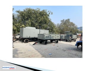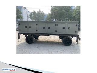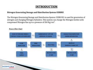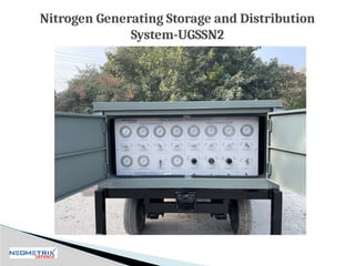 The Nitrogen Generating Storage and Distribution System (UGSS N2) is designed to generate and charge nitrogen cylinders with compressed nitrogen gas up to a pressure of 350 kg/cm2. Key components include a trailer-mounted nitrogen generation system, high-pressure storage, transportation carts, and a ground power unit, capable of producing high-purity nitrogen for various industries such as aerospace and medical equipment. The system operates under varying environmental conditions and utilizes advanced filtration and storage technology to ensure efficient nitrogen generation and distribution.