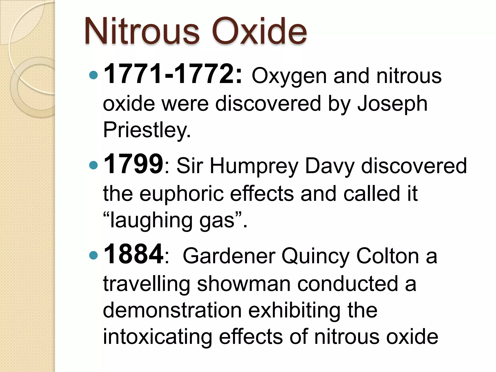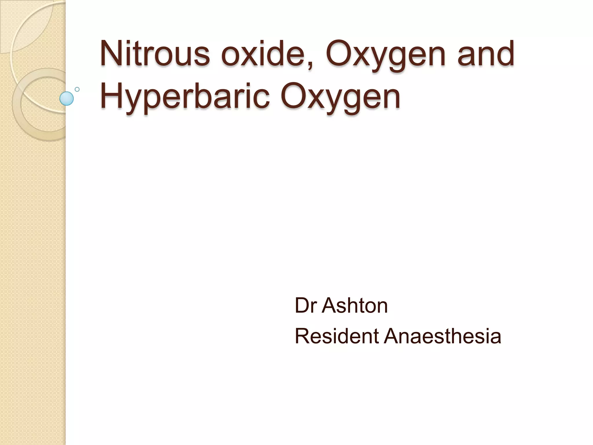 This document provides information on nitrous oxide, oxygen, and hyperbaric oxygen. It discusses the discovery and early uses of nitrous oxide as an anesthetic. It describes the preparation, properties, administration and physiological effects of nitrous oxide. Potential side effects are outlined including effects on the central nervous system, circulation, ventilation, and bone marrow. The document also discusses the discovery, production, transport and cascade of oxygen in the body. Various methods of oxygen therapy are described.