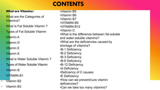 The document provides a comprehensive overview of vitamins, categorizing them into fat-soluble and water-soluble groups, detailing their functions, sources, and symptoms associated with deficiencies. It discusses specific vitamins, such as A, D, E, K, and the B vitamins, explaining their importance for bodily functions and health. The text also addresses the potential toxicity of excessive intake of certain vitamins and offers suggestions for preventing vitamin deficiencies.