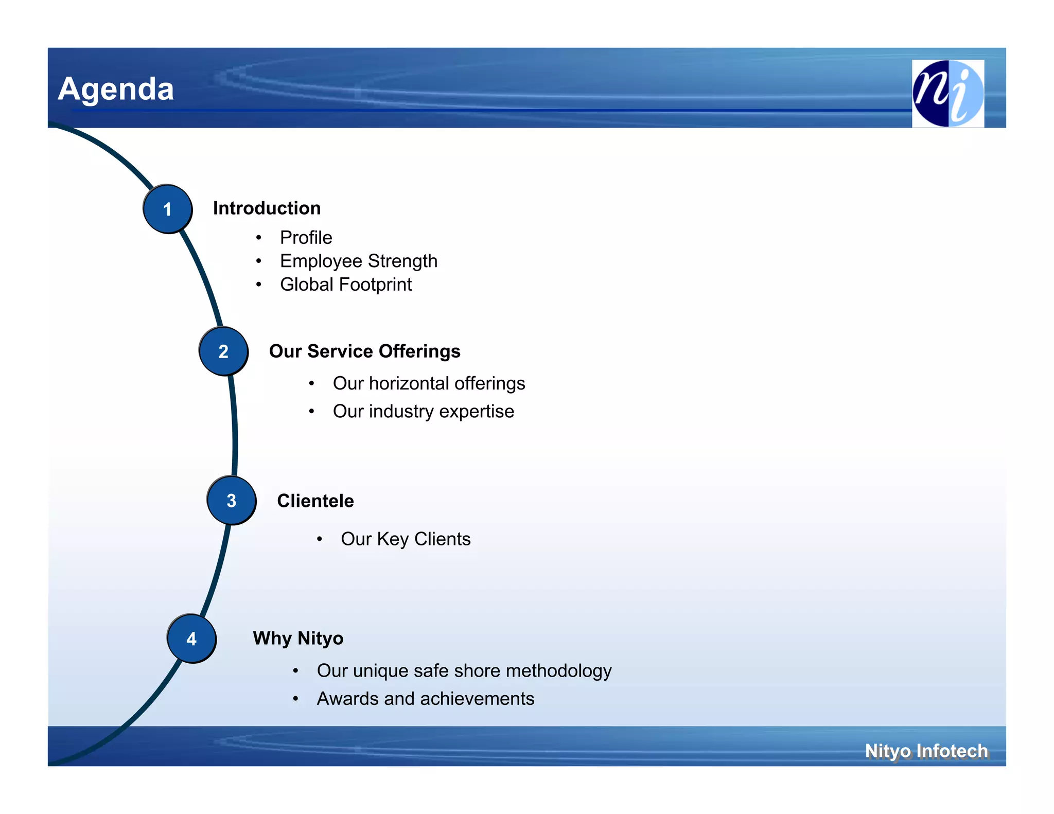 Nityo Infotech is a global IT services company with over 1000 employees across 15 offices in 10 countries. It provides consulting, technology, and talent transformation services across industries. Nityo utilizes a unique safe shore methodology for global delivery from development centers in Singapore, Malaysia, Philippines, India, and China. It aims to empower customers to focus on core business through innovative outsourcing.
