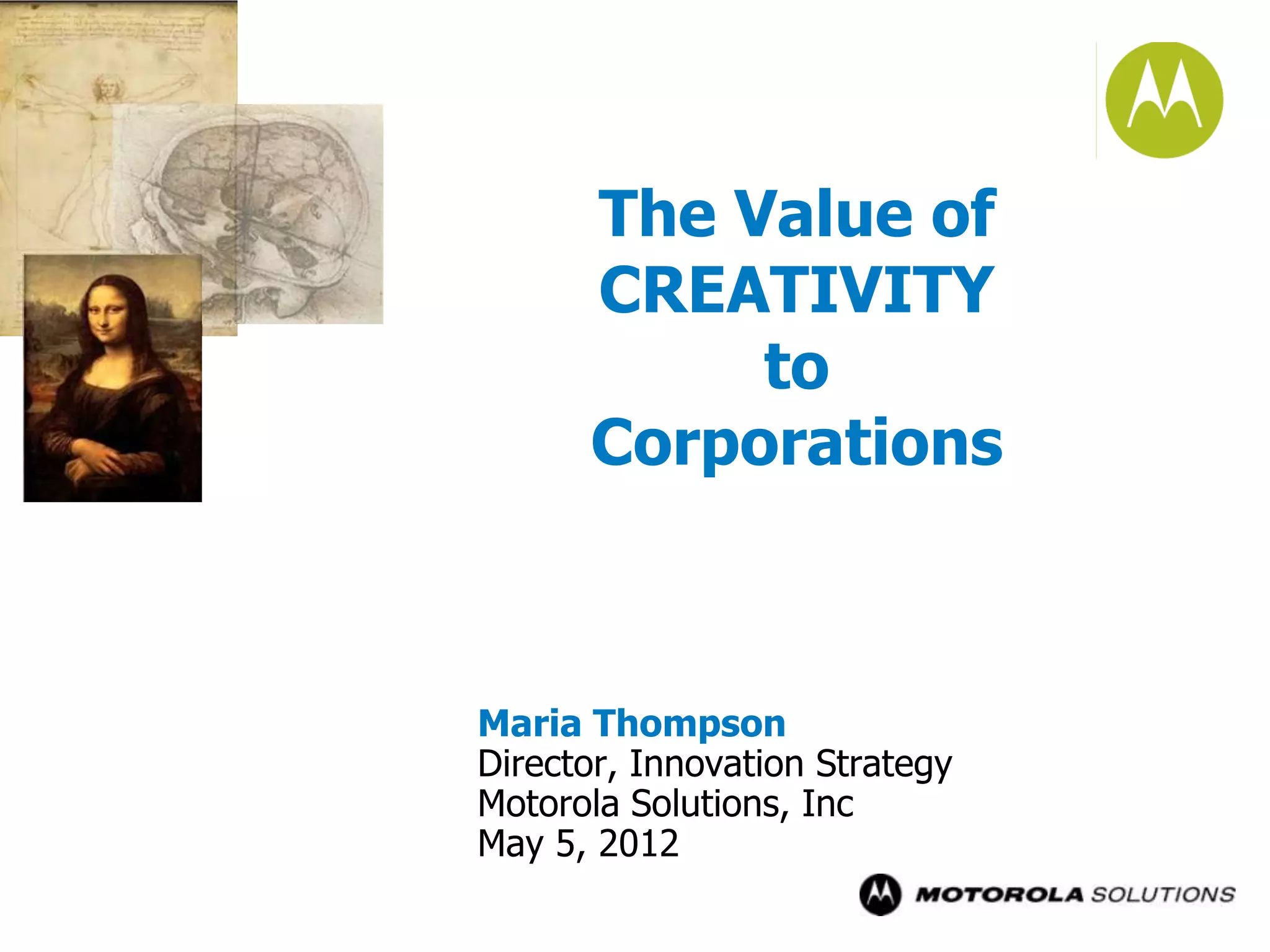 The document discusses the value of creativity for corporations and provides examples of how creativity can solve problems and drive innovation through inventions that are then commercialized. It highlights the importance of intellectual property for protecting inventions and innovations and provides insights from creative luminaries like Einstein and Edison on cultivating creativity. The document emphasizes developing a resilient mindset and using techniques like questioning to enhance creative problem solving.