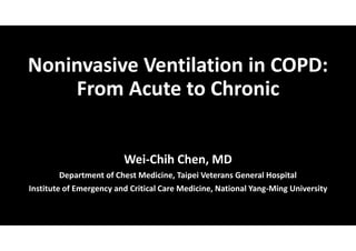 This document discusses the use of noninvasive ventilation (NIV) in patients with chronic obstructive pulmonary disease (COPD). It finds that NIV is the standard of care for COPD patients experiencing acute respiratory failure during acute exacerbations, as it can reduce mortality and morbidity. For stable COPD patients with persistent hypercapnia after an exacerbation, adding NIV to supplemental oxygen may prolong the time to readmission or death compared to oxygen alone. NIV may also provide benefits for some stable COPD patients with hypercapnia or who have both COPD and obstructive sleep apnea.