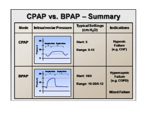 This document discusses non-invasive positive pressure ventilation (NIPPV) delivered via a nasal or oronasal mask for respiratory failure. NIPPV has been shown to be effective for acute pulmonary edema, respiratory failure in immunocompromised patients, and facilitating extubation in COPD patients. Factors vital for success include careful patient selection, timely initiation, a comfortable fitting interface, coaching, and monitoring. NIPPV should be used to avoid intubation rather than as an alternative. Conditions with strong evidence for NIPPV use include cardiogenic pulmonary edema, COPD exacerbations, and respiratory failure in immunocompromised patients. Contraindications include pulmonary fibrosis, ARDS with multi-organ failure, and