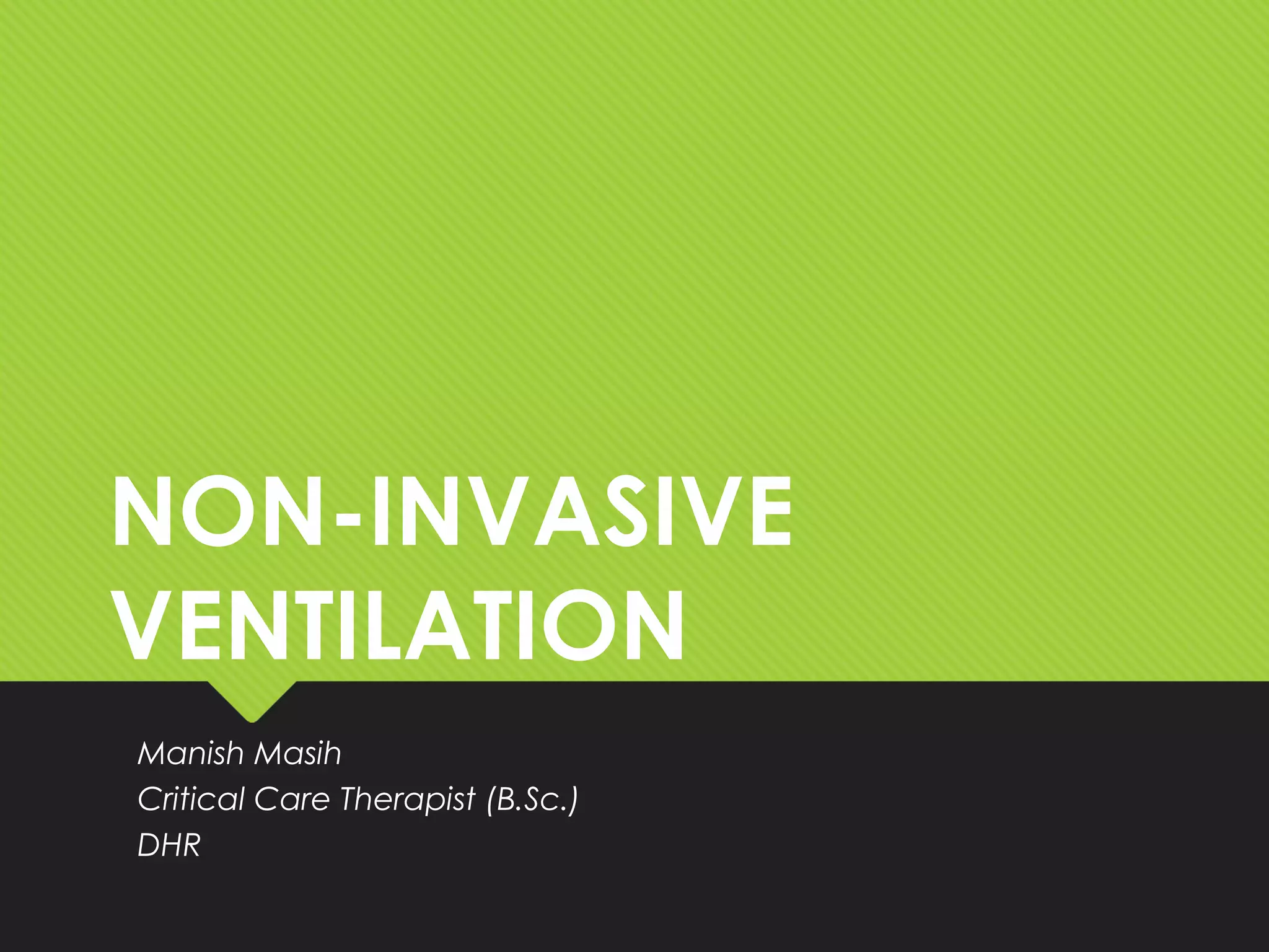 This document provides an overview of non-invasive ventilation. It discusses the history and development of respiratory support and mechanical ventilation. The objectives, definitions, theories, effects, advantages, disadvantages, indications, contraindications, modes, settings, monitoring, documentation, treatment failure criteria and discontinuation criteria of non-invasive ventilation are described. Key points include that non-invasive ventilation can avoid intubation for certain patients with acute respiratory failure from conditions like heart failure or COPD exacerbation. Close monitoring is required and intubation may still be necessary if the patient does not improve or their condition deteriorates.