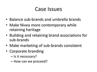 The document discusses Nivea's brand portfolio management issues and strategies for their various sub-brands. It analyzes the brand image and personality of Nivea Creme, the sources of brand equity, and how the core brand associations of caring and mildness were extended across different product classes like Nivea Sun, Nivea for Men, Nivea Shower and Bath, Nivea Hair, and Nivea Deodorant. The document also provides examples of marketing strategies and advertisements used for various sub-brands over time.