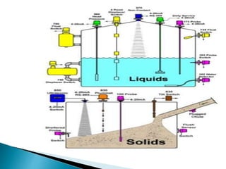 El documento describe varios métodos para medir el nivel de líquidos en tanques, incluyendo métodos directos como la varilla graduada y el cristal de nivel, e indirectos como los flotadores, manómetros, membranas, burbujeo de aire, y métodos eléctricos, ultrasónicos, de radiación y ópticos. Cada método se explica brevemente en términos de su funcionamiento, aplicaciones comunes y limitaciones.