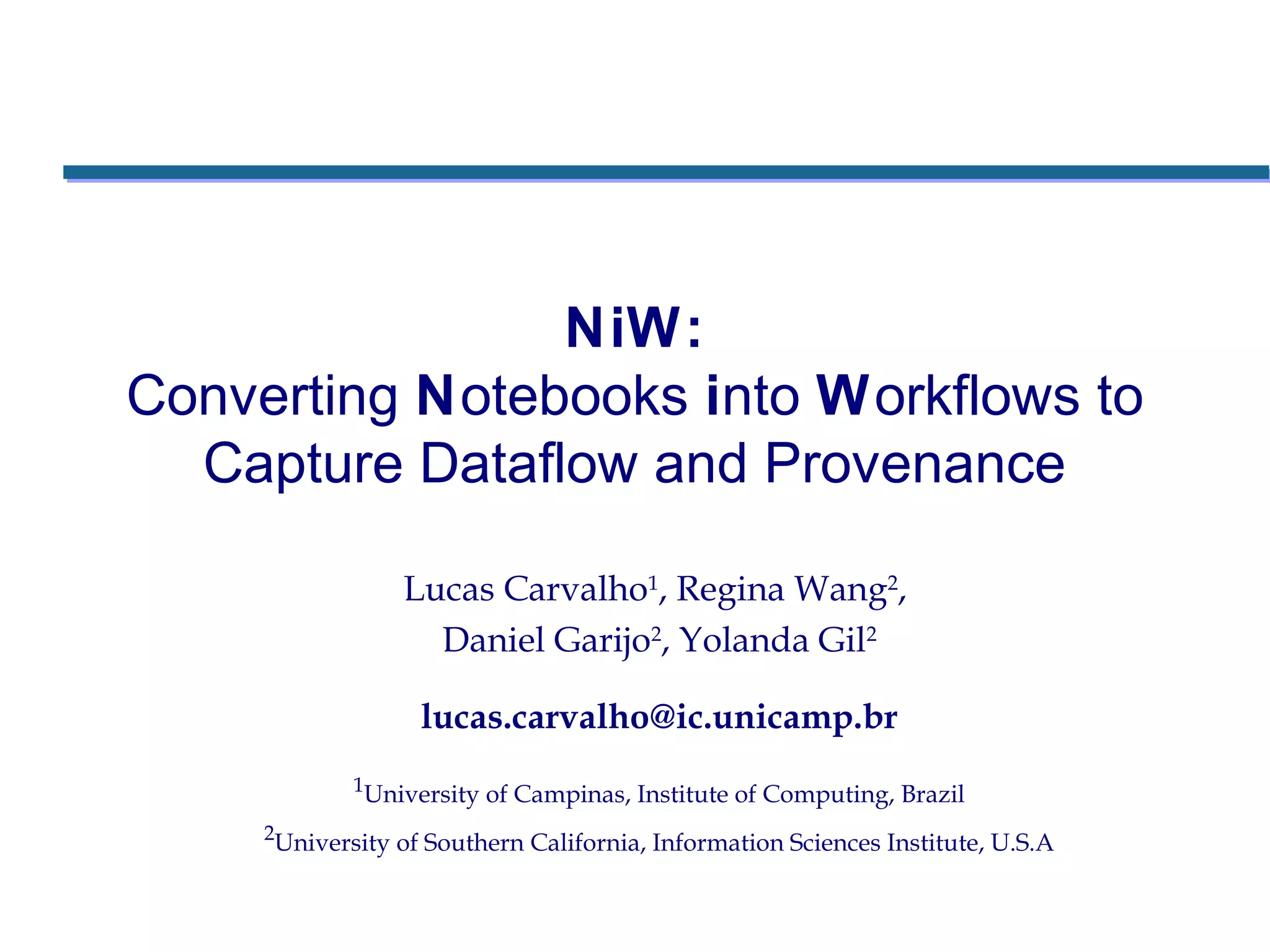 The document discusses the conversion of computational notebooks into structured workflows to effectively capture data flow and provenance. It outlines common issues with notebooks, such as unclear data inputs and outputs, and describes a framework for mapping notebook components to workflows while addressing specific challenges related to Jupyter notebooks. The proposed tool, NIW, aims to enhance readability, automate processes, and potentially improve the usability and reproducibility of data-driven research.