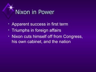 The document summarizes major events and trends in the United States between 1969-1980. It describes Richard Nixon's presidency and foreign policy successes but also the Watergate scandal that led to his resignation. It discusses the economic challenges of stagflation and energy crises. It also outlines social changes including the women's and gay rights movements and shifting family structures.