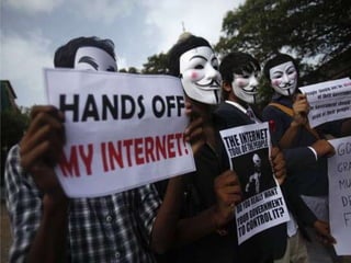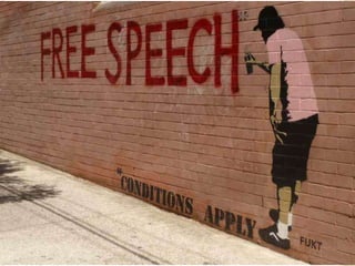 Article 19(1)(a) of the Indian Constitution guarantees citizens the fundamental right to freedom of speech and expression. However, this right is subject to reasonable restrictions related to sovereignty, security, public order, decency, contempt of court, defamation, and incitement of offenses. Section 66A of the IT Act, which criminalized sending offensive messages online, has been criticized as an unreasonable restriction on free speech. While artistic works may cause offense, the courts have held that offense alone does not amount to a criminal act. Sedition laws under the IPC must also be narrowly construed to only criminalize speech that incites violence or disorder.
