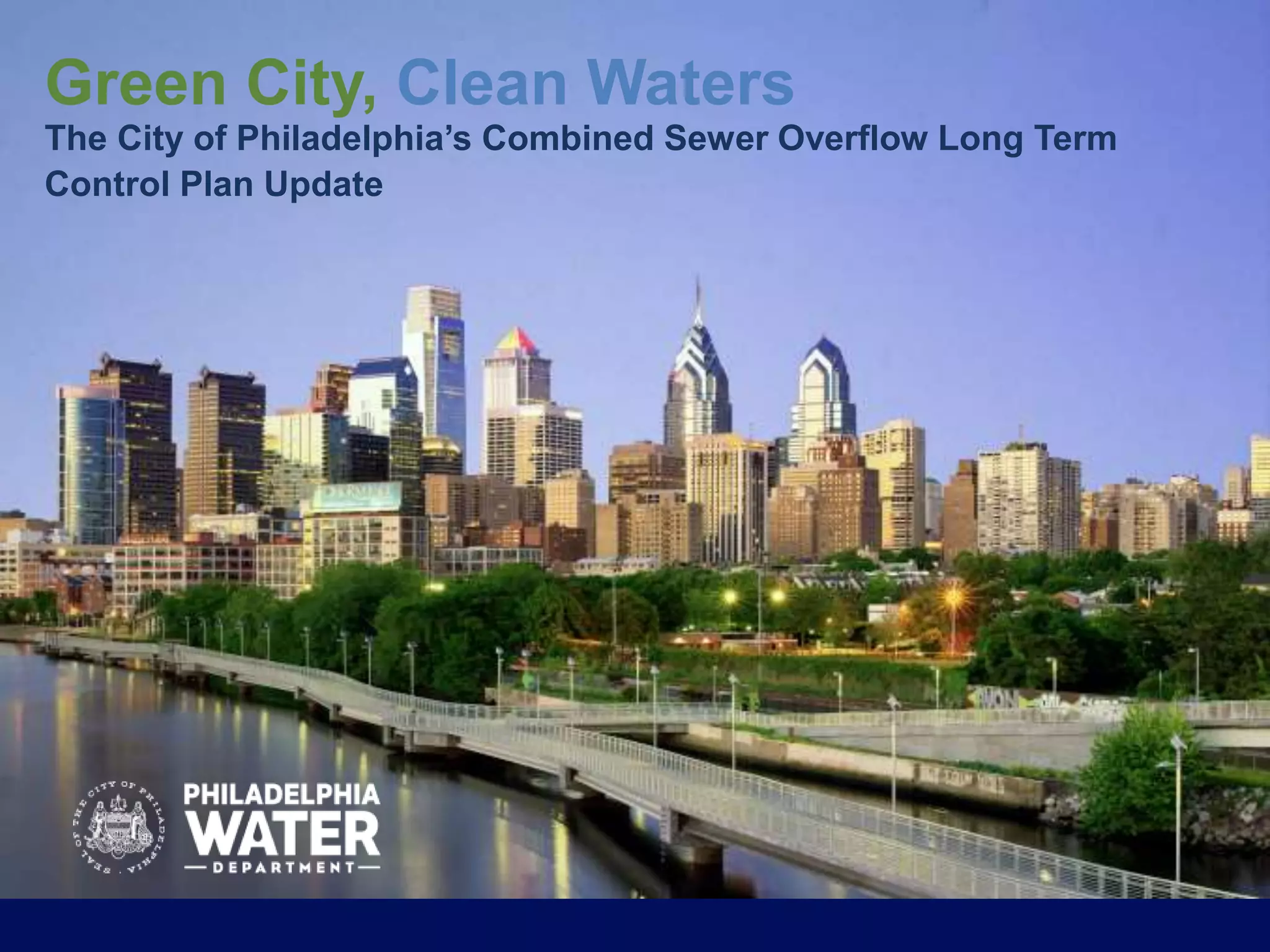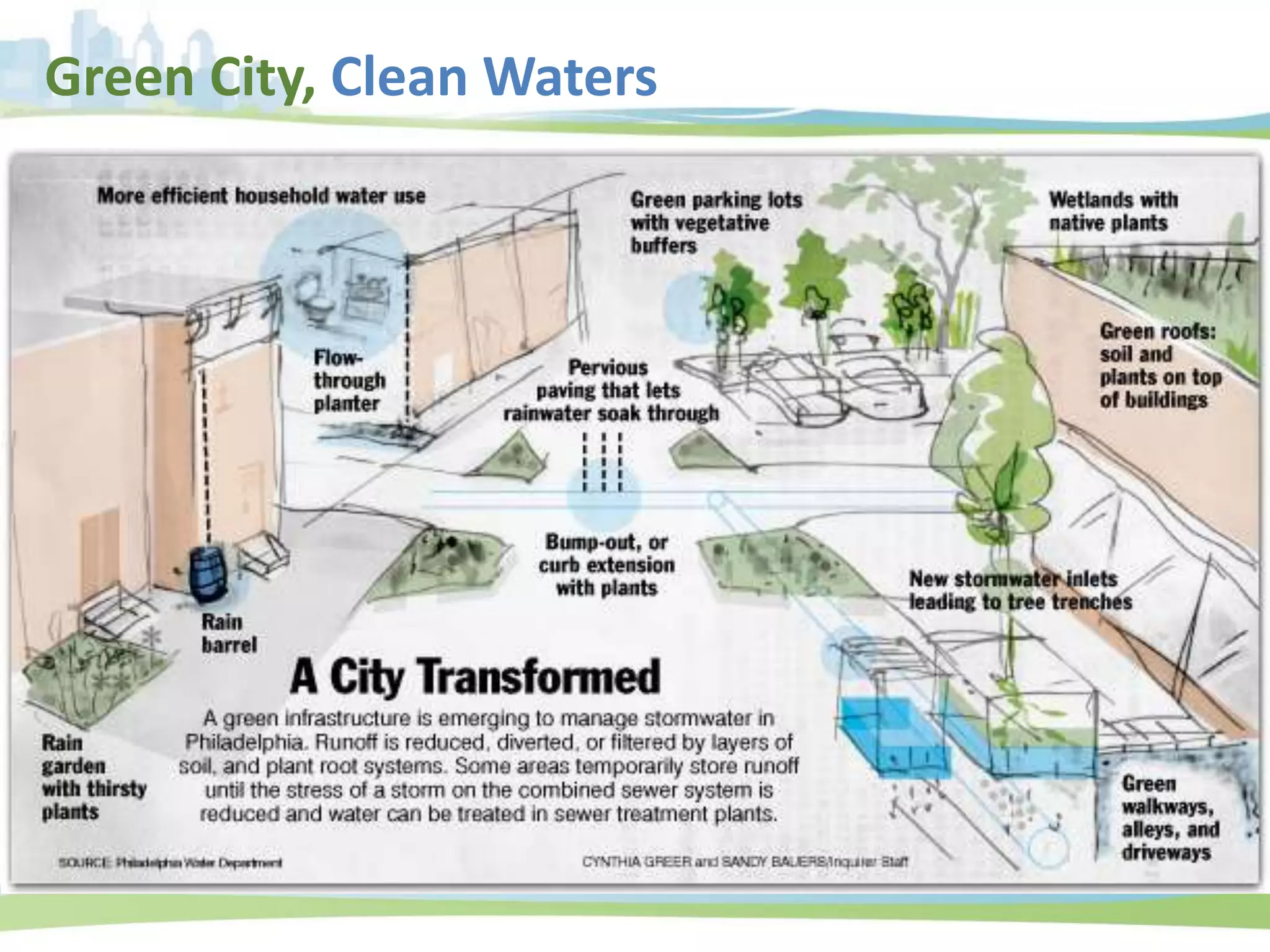 This document summarizes Philadelphia's 25-year plan to implement green infrastructure and reduce combined sewer overflows. The plan includes installing green stormwater infrastructure on public and private properties, incentivizing private retrofits, and updating regulations for new development. After 5 years, targets for interceptor lining, overflow reduction, and greened acres were exceeded. Future plans include doubling greened acreage in years 6-10. Monitoring shows green infrastructure is performing better than predicted in terms of infiltration and storage capacity. The plan's environmental, social, and economic benefits create a triple bottom line return on investment.