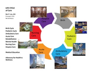 This document discusses designing buildings and communities from a health and wellness perspective. It outlines the life cycle of care from birth to end of life and describes design considerations at each stage. This includes needs for different building types like hospitals, schools, workplaces, housing, and more. It advocates applying the WELL building standard to promote air, water, light, nourishment, fitness, and comfort. The goal is to create healthy, livable communities through connected walk paths, bike trails, transportation hubs, parks, culture centers, and a sense of place.