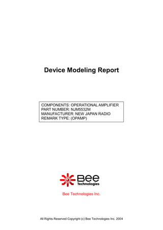 This document reports the simulation results of various performance parameters of the NJM5532M operational amplifier, including output voltage swing, input offset voltage, slew rate, input current, and voltage gain. Each metric is compared with expected values, showing minimal percentage errors, demonstrating the amplifier's reliability and performance. The report is a technical analysis conducted by Bee Technologies Inc., covering the operational characteristics of the device.