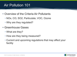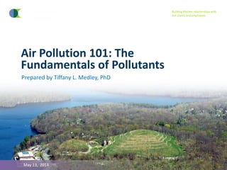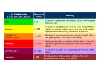 The document provides an overview of air pollution, detailing various pollutants such as nitrogen oxides, volatile organic compounds, and greenhouse gases, along with their health and environmental effects. It discusses regulatory frameworks established by the Clean Air Act and the National Atmospheric Deposition Program to reduce emissions and improve air quality. Additionally, it highlights the significance of understanding the carbon cycle and greenhouse gas reporting requirements for facilities to mitigate climate change impacts.