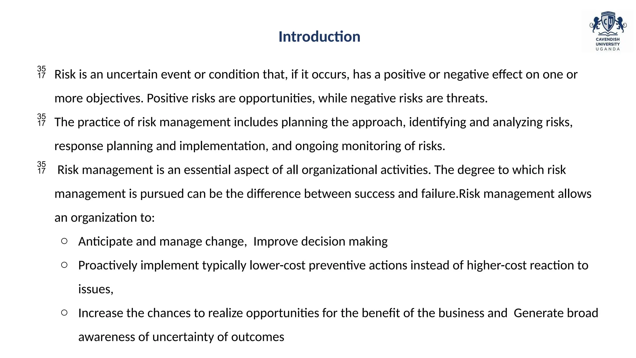 The document outlines the importance of project risk management and its methodologies, describing risk as an uncertain event that can impact project objectives either positively or negatively. It details the processes involved in risk management, including risk identification, analysis, and response planning, highlighting the benefits for organizations, stakeholders, and project managers. Additionally, it discusses when and how to implement risk management techniques, including qualitative and quantitative analysis, to enhance project performance and decision-making.
