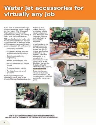 The document is an extensive catalog for NLB's high-pressure water jet technology, showcasing a wide range of products including pumps, accessories, and related services suitable for various applications. It details specifications, features, and capabilities of their equipment, which operates at pressures up to 40,000 psi. NLB emphasizes quality, reliability, and customer support, along with a focus on continuous product improvement.