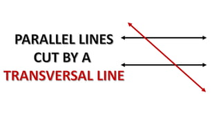 When parallel lines are cut by a transversal line, the alternate angles formed are equal, the corresponding angles formed are equal, and the co-interior angles formed are supplementary. These relationships can be used to find missing angle measures, as when parallel train tracks are crossed by a road, the angles made at the intersection follow these rules.