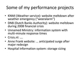This document summarizes a presentation on understanding website and application performance. It discusses diagnosing performance issues, identifying bottlenecks, and incorporating performance testing into the development process. Key topics covered include availability and response time metrics, psychological costs of slow performance, analyzing transactions and resource usage, queueing theory, and common monitoring and analysis tools. The presentation calls for collaboration to develop a standard body of knowledge on web performance best practices.