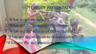 This document discusses deforestation in Kenya. It defines deforestation as cutting down trees without planting new ones. The main causes of deforestation in Kenya are mining, settlement, paper production, logging, and producing fuel. Deforestation leads to increased soil erosion, changes in water shade, desertification, landslides, pollution, and loss of habitat. The document recommends educating people, using renewable fuels, encouraging tree planting, and government regulation of logging and settlement in forests as solutions. Statistics show that Kenya loses 5.6 million trees daily, reducing its forest cover from 70% to the current 30%.
