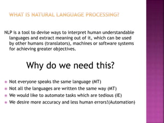This document discusses natural language processing (NLP) from a developer's perspective. It provides an overview of common NLP tasks like spam detection, machine translation, question answering, and summarization. It then discusses some of the challenges in NLP like ambiguity and new forms of written language. The document goes on to explain probabilistic models and language models that are used to complete sentences and rearrange phrases based on probabilities. It also covers text processing techniques like tokenization, regular expressions, and more. Finally, it discusses spelling correction techniques using noisy channel models and confusion matrices.